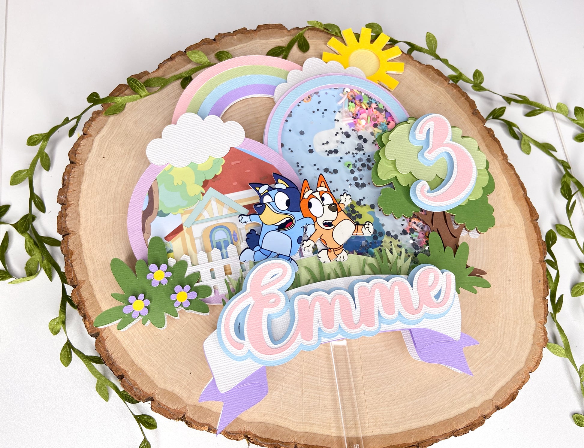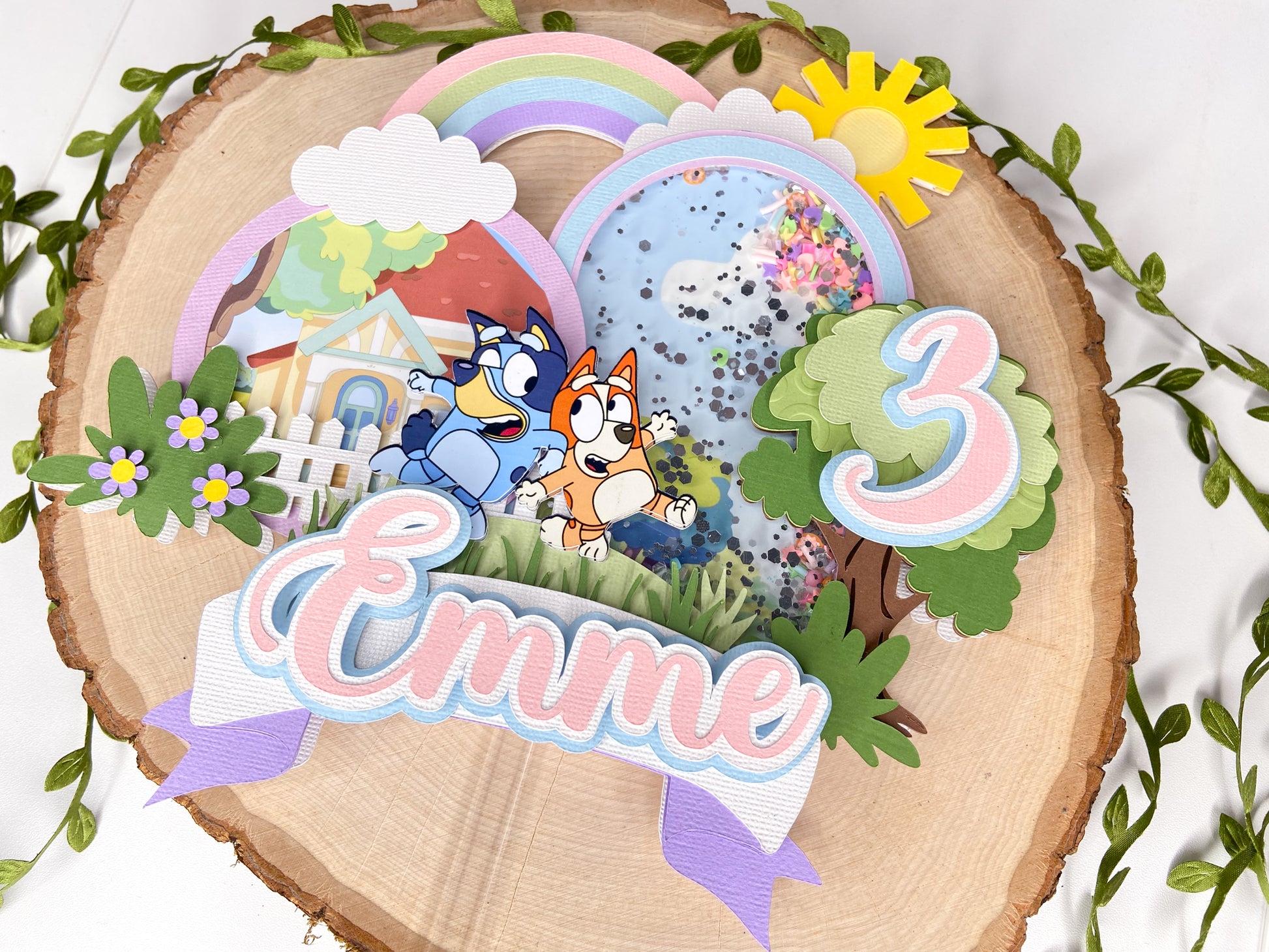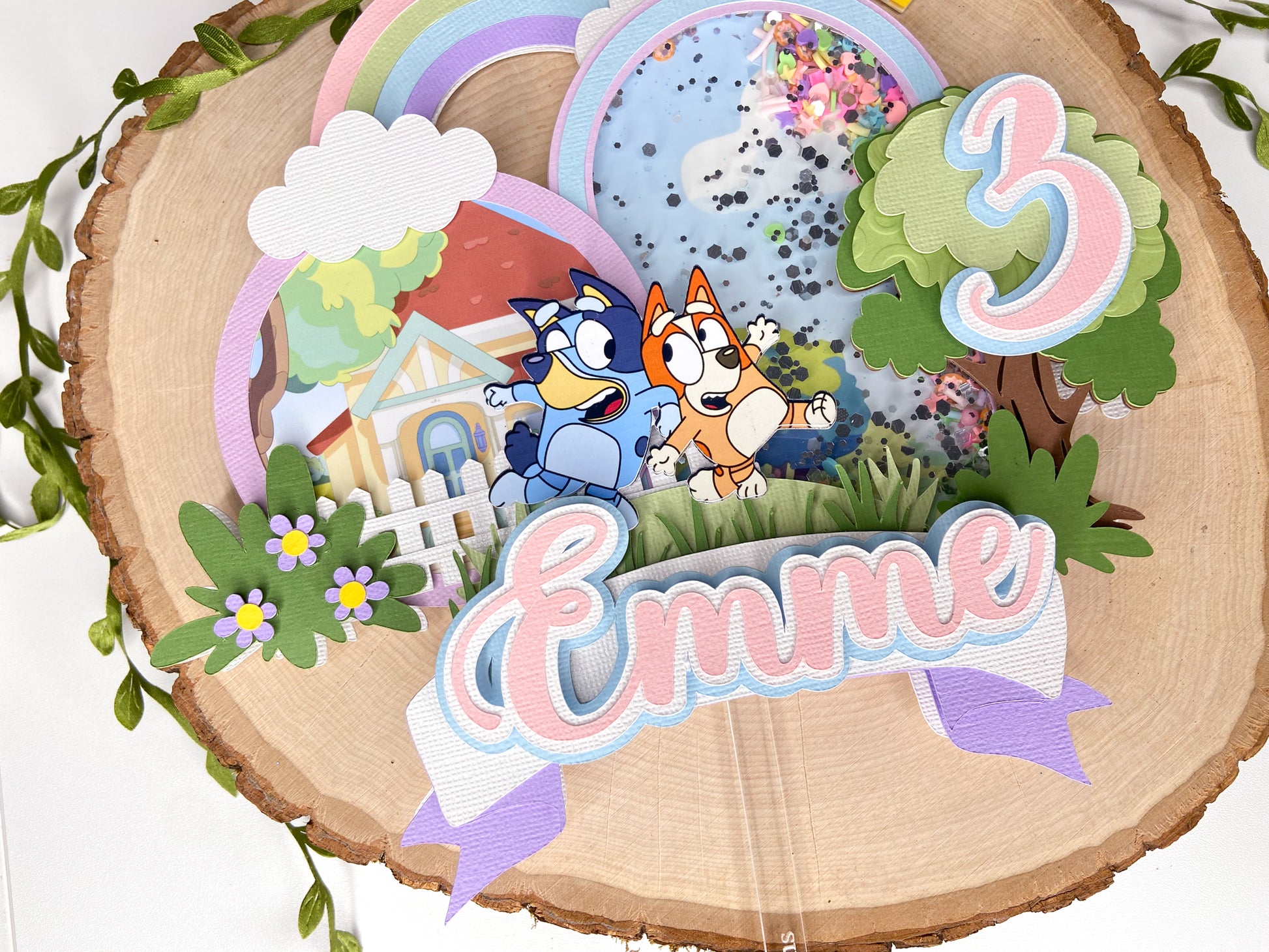 This listing is for a Bluey shaker cake topper. This item is made with premium cardstock and handmade with love!