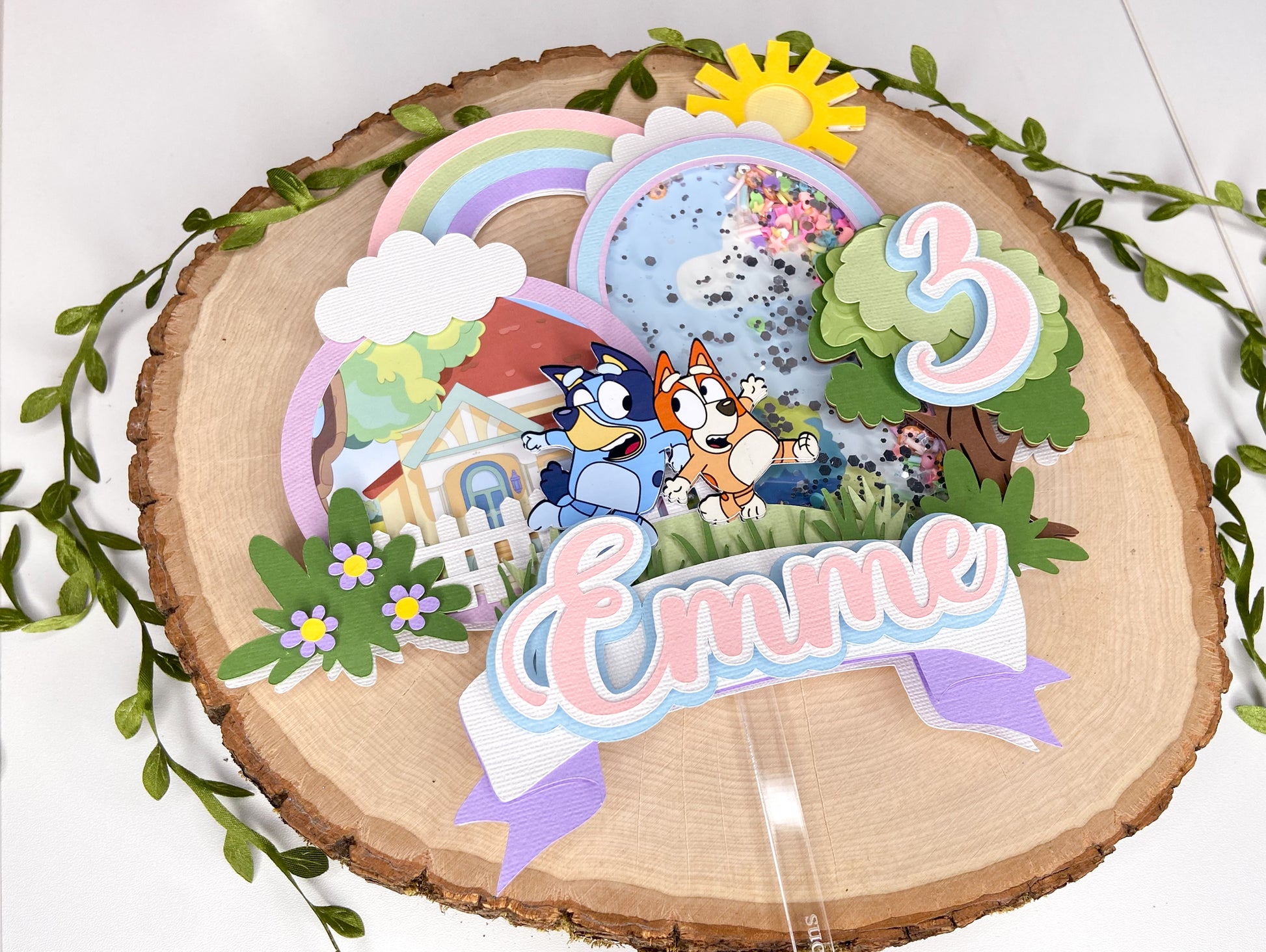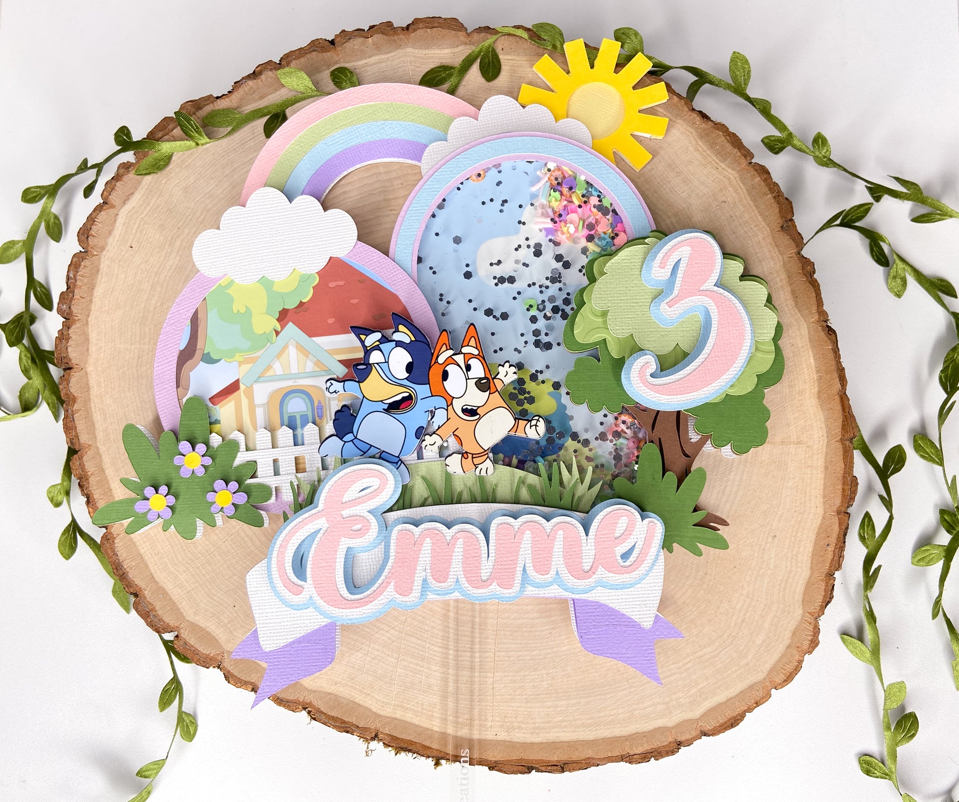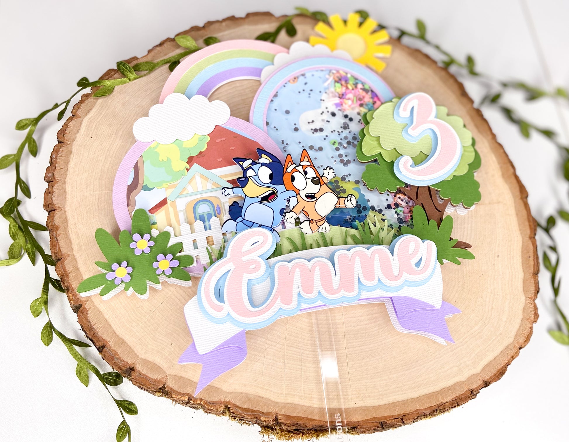 This listing is for a Bluey shaker cake topper. This item is made with premium cardstock and handmade with love!
