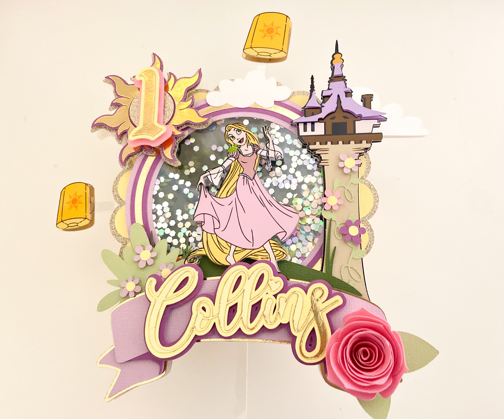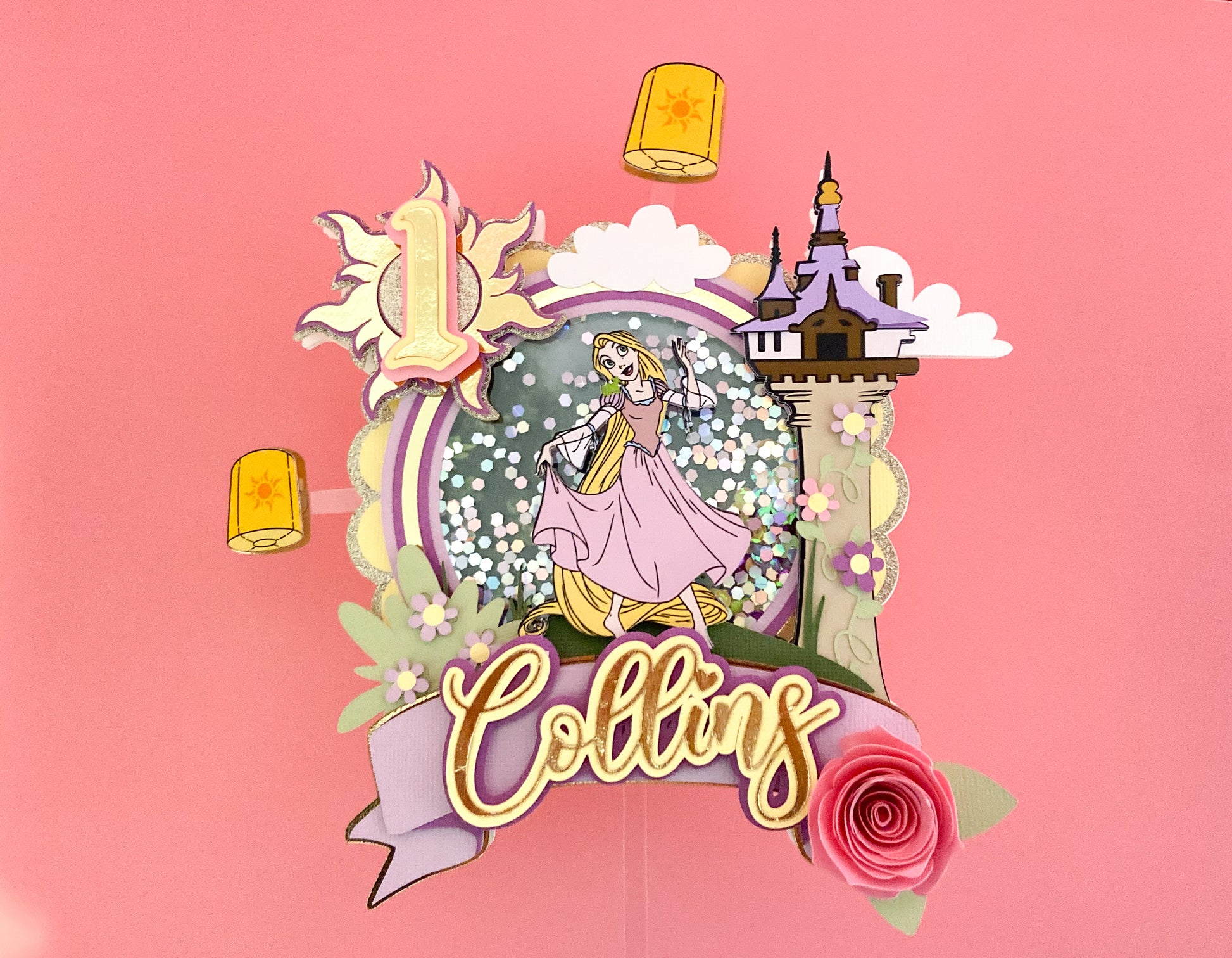 This listing is for a tangled inspired shaker cake topper with lights. This item is made with premium cardstock and handmade with love!