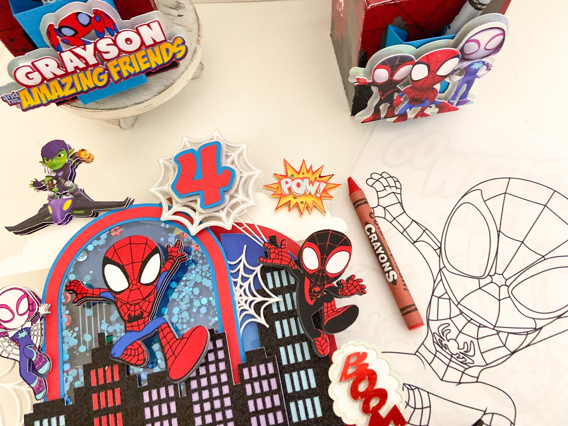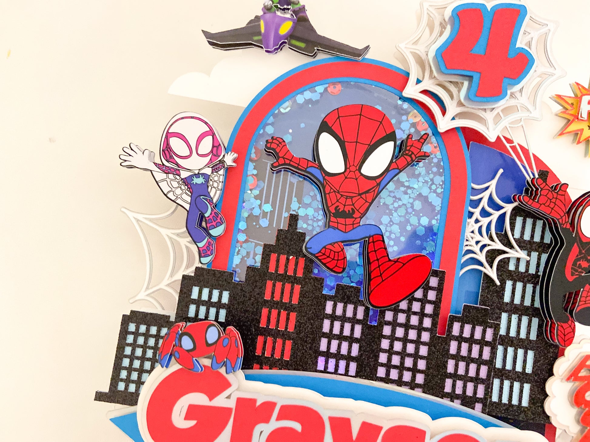 This listing is for a Spidey and friends shaker cake topper with LED lights. This item is made with premium cardstock and handmade with love!